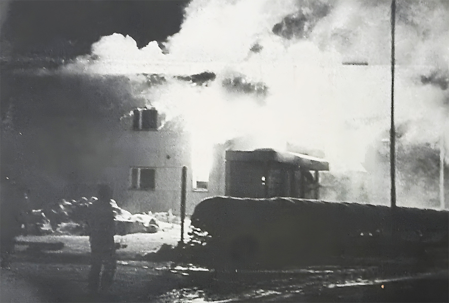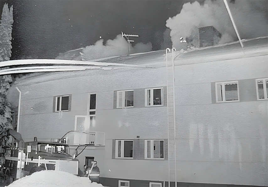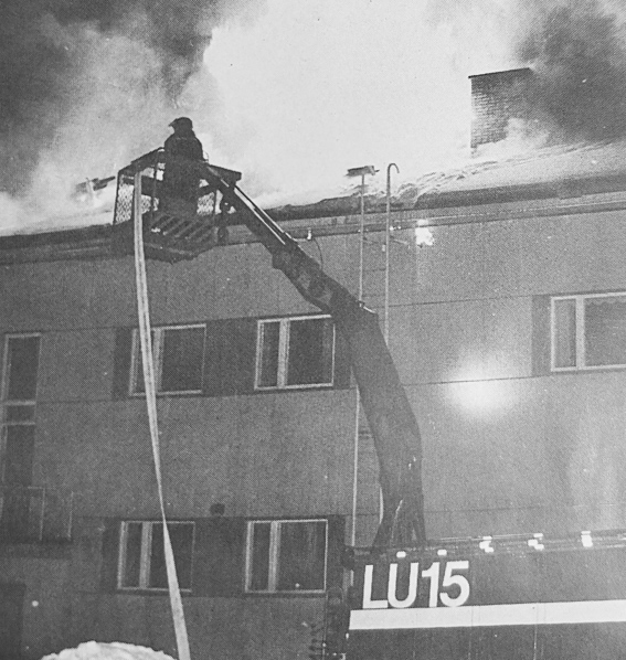 Vuosi 1986 alkoi ikävissä merkeissä – palokunnan naapurissa oleva kunnanvirastotalo tuhoutui tulipalossa keskiviikkona 8.1.1986